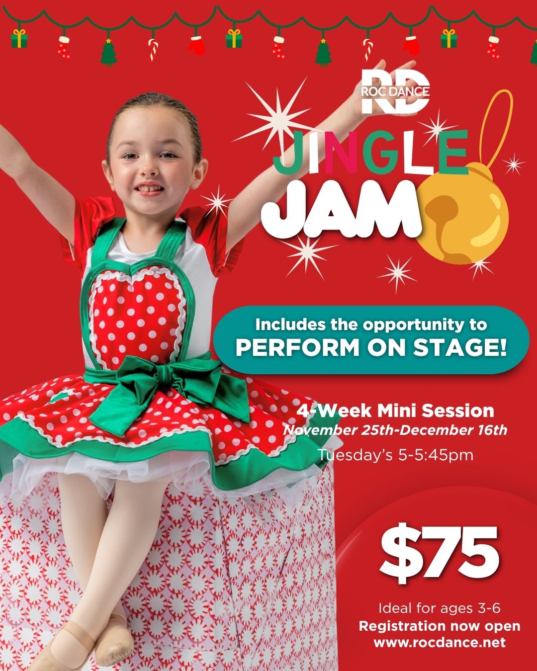 A 4-week holiday dance experience where children ages 3–6 can move, create, and even take the stage in a special Holiday performance!